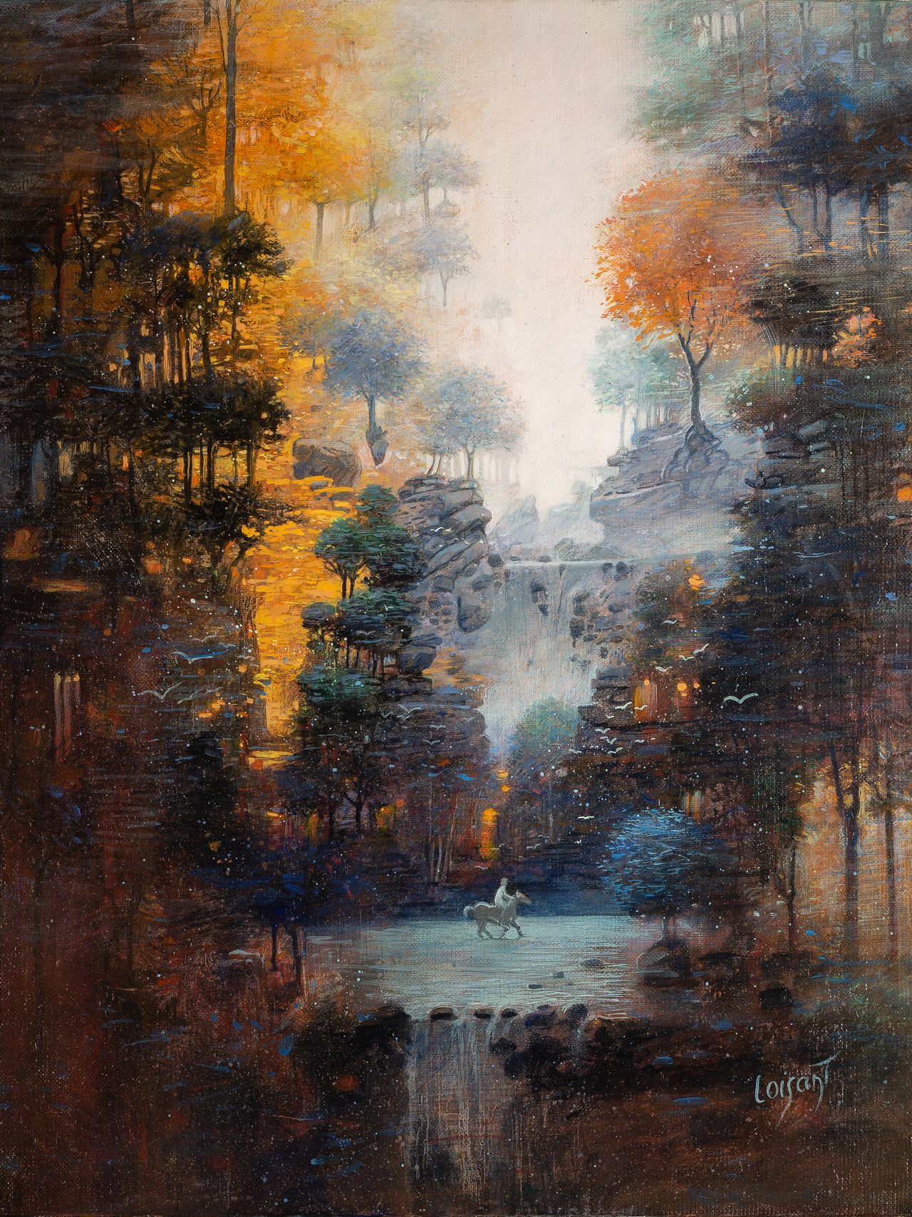Oeuvre unique en peinture à l’huile “Le cavalier sur la rivière” 46×38